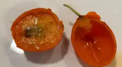 It is an evergreen small tree, growing to 6–18 m tall. The leaves are borne in opposite pairs or whorls of 3–4, each leaf blue-green, oval, 6–11 cm long and 3–5.5 cm broad. The flowers are produced in clusters on the stems. The fruit is a small, bright, orange, thin-skinned berry 1–4 cm diameter, with one single large seed; the small yield of edible fruit is pleasantly sweet, yet acidic, but also containing a latex that some people find unpleasant.[3][4]