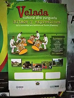 Aspects such as feasts, their creole language (that has since decreolized), religion that survived through colonialism have since gone extinct, culturally, although fragments remain.[21] Afro-Bolivians due to isolation from much of Bolivia speak a dialect of Bolivian Spanish, akin to African-American Vernacular English in the United States.[22][23][17][16] Afro-Bolivians, in addition to being Roman Catholic incorporate elements of African diasporic religions such as rituals in the Macumba and Voodoo religions have influence their practice of Christianity, mainly prevalent in the towns of Chicaloma and Mururata.[24] Musical traditions such as dances, instruments, and techniques with ancestral origin in Sub-Saharan Africa, to the present day define Afro-Bolivian identity.[25][26]