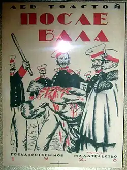 In "After the Ball," Tolstoy reuses motifs from his earlier works, such as the gloves from Childhood and boots from Youth, both of which were works based on his own life.[2][3] Furthermore, characters and scenes from "After the Ball" are similar to those in War and Peace, which was published in 1869 and explores the same issues of governance, love, loss, and betrayal.[2] Specifically, the colonel is reminiscent of the character Nikolai Rostov (from War and Peace), and the ball in the short story evokes themes similar to those in the soirée at the beginning of the novel.[2]
