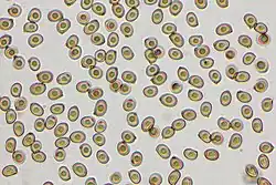 The spore print is chocolate brown.[3] The smooth, thick-walled spores are elliptical, and typically measure 5–6.5 by 3.5-4 μm. Cystidia on the gill edge (cheilocystidia) are scattered, club-shaped to cylindric and have dimensions of up to 22 by 7 μm.