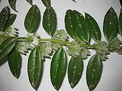 Agarista populifolia is a plant species in the family Ericaceae with the common name of Florida hobblebush. It forms dense thickets which are difficult to penetrate, thus the common name. Stems often arching. It is found in the southeastern United States inhabiting moist to wet woodlands. It is an evergreen shrub with small white flowers on the underside of its arching branches.[3][4][5]
