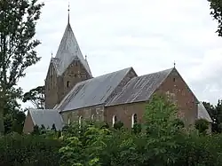 Agerskov Church is a Romanesque church made of ashlar built around 1200 with extensions added in 1300 and again in 1500. The church features a peculiar type of spire known especially from the region previously connected to Tørning Mill, where the spire is just above four triangle-shaped gables.[3]