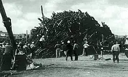 The students of the Agricultural and Mechanical College of Texas, known as Aggies, burned their first bonfire on November 18, 1907, to congratulate the football team on a recent win.[4] The first on-campus Aggie Bonfire, a heap of trash and debris, was burned in 1909 to generate enthusiasm for a variety of sporting events. A decade later, the focus of the event narrowed to the annual rivalry game between Texas A&M and the University of Texas, held near Thanksgiving Day.[5] Little information was recorded about the early Bonfires; the 1921 Texas A&M yearbook mentioned the "final rally" of the students before the game against Texas, but did not refer to a bonfire. Six years later, the school yearbook published a photograph of the event.[3]