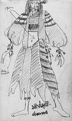 When he begins his journey into the mountains, a charming song on the magic of fire is sung by the Yajakee (the priestess). She says that the fire is the flower that has not yet bloomed on the earth. It is a talisman to the man. Bubbling pleasure and hopes are expressed in a rhythmic and leaping melody. It is sung to herald the fire goddess.