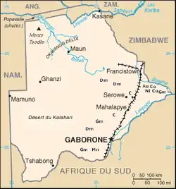 Botswana lies along a continental drainage divide. The southern and central regions, dominated by the Kalahari Desert, lack permanent watercourses, and the central desert also lacks seasonal streams. In the north, the Okavango Delta, the world's largest inland river delta, is a key feature. The Limpopo River flows along the eastern border with South Africa, while the Botletle River is the largest river entirely within Botswana.[8]