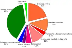 Botswana is a middle-income country, below the global average but above the African average. According to the HDI, it ranks 118th out of 187 countries.[9] At independence in 1966, Botswana was among the world's poorest nations, with minimal infrastructure, no industry, and unexploited mineral resources.[10] Agriculture then accounted for 40% of GDP, supplemented by remittances, mainly from South Africa.[11] The discovery of mineral resources (primarily copper and diamonds) in 1967 spurred development, transforming Botswana into a middle-income nation.[10] Unlike many rapidly developing countries, Botswana sustained economic growth for three decades.[12] By the 2000s, agriculture's GDP share fell to 2.7%, largely due to agricultural challenges rather than industrial or service sector growth.[13] Agriculture employs over 20% of the workforce.[14]