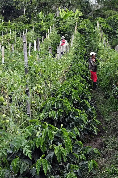 The benefits of agroecology are not only economic, but also important ecologically. There is evidence to indicate that the agroecosystems with overstory shade trees like coffee or cacao plantations can rival the biodiversity of natural forests.[17][18][19] The diversity is so high in these systems because the overstory is structurally and floristically complex[3] which allows for many different niches to be available resulting in refuges. It is possible that shade coffee plantations are already serving as refuges, as seen in Puerto Rico where tremendous deforestation has occurred and yet the avian extinction rate is relatively low.[3] Another system that is ecologically important is neotropical kitchen gardens. Kitchen gardens or home gardens are common in tropical and subtropical areas and they provide food and income for the family.[17] Some kitchen gardens like the Mopan Mayan of southern Belize contain dozens of tree and plant species of different stories mimicking a natural forest.[17] These patches, much like shade plantations, serve as refuges for flora and fauna such as in Belize where they are used by migratory birds.[17]