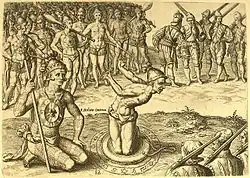 The Acuera, one of the peoples noted by the French as part of Chief Utina's alliance, encountered the conquistador Hernando de Soto's expedition in 1539. De Soto stole corn from the Acuera while camped out in the nearby town of Ocale.[8] However, extensive contact with Europeans did not occur until 1564, when the French Huguenots from the recently established Fort Caroline in present-day Jacksonville first visited the area. The French noted that at this time all the villages along the middle St. Johns, as well as some farther into the interior such as those of the Acuera, were part of a chiefdom ruled by a young leader named Utina. Though only 25 years old, Utina had sovereignty over forty other chiefs and their villages, and was one of the most powerful figures in northern Florida.[9][15] The exact nature of Utina's chiefdom is unclear. He may have been the paramount head of an integrated chiefdom, or he may have been simply the leading chief in a confederacy of smaller chiefdoms. In any case he was treated as a powerful leader by the French and Spanish.[11]