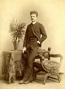 To commemorate the semicentennial of the Kalevala's first publication, the Finnish Literature Society—under the leadership of its chairman, the Finnish senator G. Z. Yrjö-Koskinen—organized a festival on 28 February 1885.[6] The highlight was the premiere of a new Kalevala-themed composition by Finland's then-leading composer: Robert Kajanus's Aino, a symphonic poem (Swedish: symfonisk dikt; Finnish: sinfooninen runoelma) for male chorus and orchestra. Kajanus conducted the Helsinki Orchestral Society (which he had founded in 1882)[7] and an unnamed (likely amateur) choir at the Ceremonial Hall of the Imperial Alexander's University of Finland.[6][8] For Helsingfors Dagblad, the music critic Karl Wasenius (pen name 'Bis') wrote a favorable—if largely descriptive—review, complimenting the piece as "captivating and beautiful... gripping and elevated all the way to the final chord".[9][b] At the concert, Kajanus also conducted Kullervo's Funeral March (Kullervon surumarssi), his 1880 setting of Kullervo's demise in Runo XXXVI, as well as his Finnish Rhapsody in D minor (1881).[6]