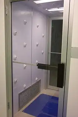 Air showers are specialized enclosed antechambers which are incorporated as entryways of cleanrooms and other controlled environments to reduce particle contamination.[1] Air showers utilize high-pressure, HEPA- or ULPA-filtered air to remove dust, fibrous lint, and other contaminants from personnel or object surfaces. The forceful "cleansing" of surfaces before entering clean environments reduces the number of airborne particulates introduced.[1][2]