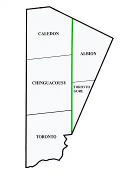In Peel County (now Peel Region), Airport Road served as the north-south dividing line between the original five townships within the county; with Caledon, Chinguacousy, and Toronto (not to be confused with the City of Toronto), to the west, and Albion and Toronto Gore to the east. Airport Road ceased being said divide after the county was restructured into the present regional municipality with the five townships incorporated into the three present lower-tier municipalities (Mississauga, Brampton, and Caledon) that each span its width in 1974.[12]