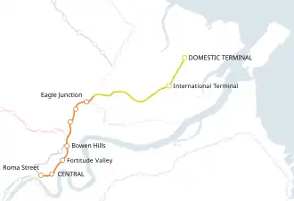 Commencing at the Domestic Terminal, all services stop at the International Terminal and then all stations though the Brisbane CBD to at least Roma Street. The typical travel time between Domestic Terminal and Brisbane City is approximately 22 minutes (to Central). This travel time results in an average train speed of 43 km/h (27 mph).