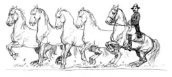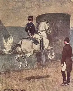 There is a popular conception that these movements were originally taught to horses for military purposes, and indeed both the Spanish Riding School and the Cadre Noir are military foundations. However, while agility was necessary on the battlefield, most of the airs as performed today would have exposed the vulnerable underbelly of the horse to the weapons of foot soldiers.[2] It is therefore more likely that the airs were exercises to develop the military horse and rider, rather than to be employed in combat.