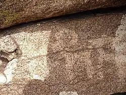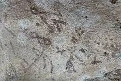 Paintings on the cave walls were drawn in brown ocher, dating to approximately 3000 BC. The content of the paintings is complex, and includes shapes such as triangles and rectangles, lines, dots, and sketches of people.