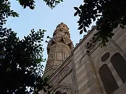 The interior decoration also contains elements of Mamluk state of Circassia gathered in details. This is a small, albeit protected beautifully stained marbles which cover the walls and the roofs above the windows decorated with colored glass to create the sense of consistency. Its wooden ceiling is also considered one of the outstanding crafts of all the Egyptian historic mosques, and the skillful carpentry craftsmanship is also displayed in the work of minbar or handrails.[3] The minaret is unique since it is the only minaret during the Ottoman time to have a band with an inscription of the date 1623 around the octagonal bottom part of the minaret.[4]