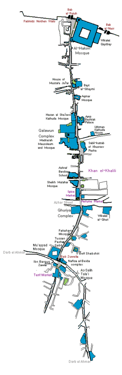 Below is a list of notable or recorded historic monuments, from many different periods, which are situated today along al-Muizz street.[2] The list goes (roughly) from the north to south, starting at Bab al-Futuh and ending at Bab Zuweila.