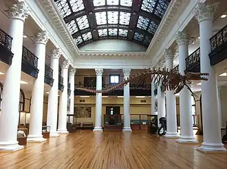 The exhibits depict the natural diversity of Alabama from the Age of Dinosaurs, the Coal Age, and the Ice Age. Collections include items relating to geology, zoology, mineralogy, paleontology, ethnology, history, and photography.[1] The Grand Gallery Exhibition Hall houses a replica of a Basilosaurus cetoides, an Eocene whale that has been designated as the State Fossil.