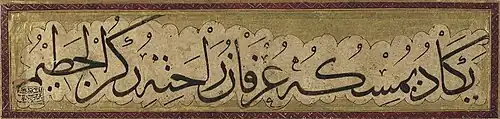 Calligraphic panel with prayer in thuluth, which reads "the grasping of God brings the knowledge of His comfort".[1][2][3] The later inscription attributed this work to Alaeddin Tabrizi. (Library of Congress)