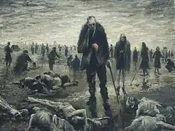 In 1945 Moore accompanied the British 11th Armoured Division when they liberated the Bergen-Belsen concentration camp in Germany.[4] He spent three days sketching and painting the state of the camp, its prisoners and their captors, including Fritz Klein.[1][14] It was suggested by one soldier that nobody would believe the portrayals, prompting Moore to also photograph the scenes as proof.[4][15]