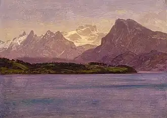 Alaskan Coast Range is an 1889 landscape painting by the German American painter Albert Bierstadt that presently hangs in the Smithsonian American Art Museum. While traveling through British Columbia, Bierstadt took a steamship to Alaska in search of more rugged landscapes. He ended up shipwrecked in Loring, Alaska. While sheltering in a nearby Native American settlement, he drew his littoral Alaskan surroundings; this work is most likely an oil sketch made for further detailing.[1]