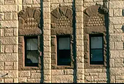 On either side of the loggia is a recessed narrow one-over-one double-hung sash with a blind third pane above. A stone course sets off the arched transom above, framed by a splayed block arch. To the north is a similarly treated wider double window, its tympanum painted with an intricate sunburst design.[12] Around the corner, on the north facade, fenestration of the second story begins with a similarly styled window. To its east is a large quadruple window that echoes the loggia, with the same surrounds around groups of three narrow sash windows topped by two separated panes and tripartite transom under the arches.[10]