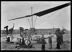 Von Baumhauer's design made some major achievements which greatly influenced further development of helicopters.[3][4] It used a single rotor, as opposed to two counter-rotating rotors on which most contemporary designs were based. He was one of the first to use the tail rotor to counteract the torque produced by the main rotor.[5] The tail rotor was powered by its own engine (for easier control) and its angle of incidence could not be adjusted during flight. Another notable achievement was use of collective and cyclic pitch control.[6] The swashplate principle was applied. Below the rotor, two concentric rings were mounted, connected to each other with bearings. The non-rotating inner ring could be tilted and moved along the rotor shaft. The outer ring rotated with the rotor and adjusted blade angles via rods. This enabled adjustment of blade pitch according to the blade's current angle, a mechanism which is still used in modern helicopters.