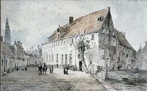 Soon, however, he began participating in local exhibitions and, in 1853, was awarded the "Grote Koninklijke Medaille" for painting.[1] In 1858, his work "Rural Simplicity" won an award from Pictura, the local art society, and he was commissioned to do a series of watercolors depicting the interior and exterior of the Groene Weeshuis, a 17th-century orphanage that was due to be demolished. Three years later, he provided a series of cityscape drawings for the lithographer, Carel Christiaan Antony Last, who published them as the Album der stad Groningen.