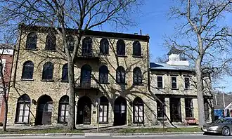 The Albertus Building, also known as the Gutenberg Haus, or locally as “The Rathskeller” (now the official business name) is a historic building located in Guttenberg, Iowa, United States. The two-and three-story structure of locally quarried limestone was completed around 1855 by C. Albertus. A unique feature of the building are the pointed arch doorways and windows, which have not been found on similar commercial buildings in Iowa.[2] The building was initially used for a combination of commercial and residential use. Clothing and grocery stores were located on the first floor of the southern three-story block. By 1886 the northern two-story block was all residential, and by 1894 the whole building had gone residential.