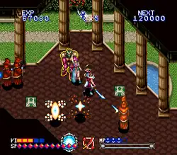 The player acts as the swordsman Alen across eight stages filled with a variety of blocks that propel him forward or send him leaping to another area, exploring and searching for items and power-ups, while fighting enemies and bosses.[1][5][6][9][10] During the journey to stop Alcahest, the player encounters allies who join Alen's party one at a time. They are the wizard Garstein, the princess Elikshil, the knight Sirius, the cyborg Magna, and the shape-shifting dragon goddess Nevis. Allies attack and use special powers, but they cannot be controlled directly and special points (SP) are required for their special move.[1][2][3][5][11]