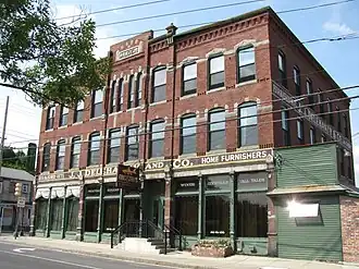 The block was built in 1888 for William E. Alden, who operated a dry goods store on the first floor. The building originally housed shops on the ground floor, offices on the second, and a meeting hall space on the third floor. The latter was used for a time by the Ancient Order of Hibernians, and has been known as Hibernia Hall. The building was acquired in 1899 by John Delehanty, who owned a furniture store that had expanded to occupy the entire building. Except for some minor alterations to the cornice and parapet, the exterior of the building is unaltered from its initial construction.[2]