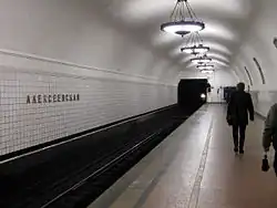 The station was originally named Mir, but was changed to Scherbakovskaya in 1966 in honor of Aleksandr Shcherbakov, a founding member of the Union of Soviet Writers. In November 1990, the city renamed the station Alekseyevskaya for the historical settlement of Alekseyevskoye, which once belonged to Prince Dmitry Troubetskoy.[1]
