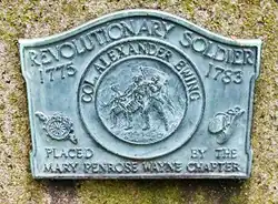 Alexander Ewing was born in Connecticut in 1768 and most likely grew up in Northumberland County, Pennsylvania; his ancestors are believed to have descended from Clan Ewing.[5][2] Ewing enlisted as a private in the First Company, Fourth Battalion of the Cumberland County Militia, serving from 10 August 1780 until the end of the war.[3][7] After the war Ewing joined a trading expedition, eventually setting up a trading post in a remote wilderness that would later become Buffalo, New York.[8] After losing his farm to debt, Ewing moved new wife Charolette and his young family to join his brothers Samuel and William in the River Raisin in Frenchtown, Michigan Territory (present-day Monroe, Michigan).[9] The family later moved to Piqua, Ohio.