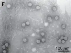 Algal viruses are viruses that specifically infect the photosynthetic, single-celled eukaryotes known as algae. As of 2020, there were 61 viruses known to infect algae.[1] Algae are integral components of aquatic food webs and drive nutrient cycling, so the viruses infecting algal populations also impacts the organisms and nutrient cycling systems that depend on them. Thus, these viruses can have significant, worldwide economic and ecological effects.[2] Their genomes varied between 4.4 and 560 kilobase pairs (kbp) long and used double-stranded deoxyribonucleic acid (dsDNA), double-stranded ribonucleic acid (dsRNA), single-stranded deoxyribonucleic acid (ssDNA), and single-stranded ribonucleic acid (ssRNA). The viruses ranged between 20 and 210 nm in diameter.[1] Since the discovery of the first algae-infecting virus in 1979, several different techniques have been used to find new viruses infecting algae and it seems that there are many algae-infecting viruses left to be discovered[1][3]