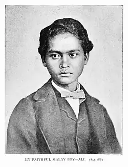 Alfred Russel Wallace travelled to the Malay archipelago in March 1854 along with his collecting assistant Charles Martin Allen (1839–92). During his travels he hired as many as 1200 people at various points of time and in various places. Among them some made an impression on him and were credited in his writings.[1] When they arrived in Singapore on 18 April 1854, Wallace hired a Malay boy named Ali. He described him:[2]