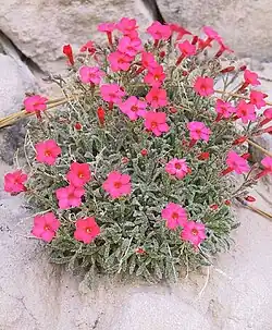 This perennial herb has a thick basal clump of sticky leaves growing just a few centimeters tall. The flowers are scarlet to blue-purple[2] in color, sometimes fading maroon or purple.[1] Flowering occurs in June and July,[1] and seeds are produced in July and August.[2]