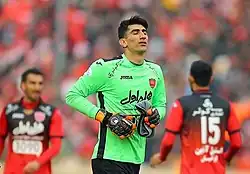 Beiranvand has played with Naft Tehran since 2011.[19] He made his debut in the Hazfi Cup against Damash on 25 October 2011.[20] There were links between him and the red half of Tehran, Persepolis, but the chairman of Naft Tehran, Mansour Ghanbarzadeh, did not allow him to leave the club.[21] In his first year as the first-choice goalkeeper, Beiranvand led the team to a 3rd place League finish and a spot in the AFC Champions League for the first time in the club's history. On 23 March 2014, he extended his contract with the club until June 2019. On 24 November 2014, Beiranvand provided an assist in their match against Tractor Sazi by throwing the ball into the opponent's half.[22]