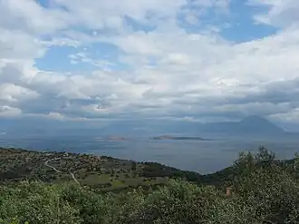 The Alkyonides Gulf (Greek: Κόλπος Αλκυονίδων - Kolpos Alkyonidon) is a bay that connects with the Gulf of Corinth to the west.[1] The bay is approximately 20 to 25 km long and 20 km wide. It stretches from Aigosthena to Cape Trachilos from east to west and from Cape Trachilos to the peninsula of Perachora from north to south. Three regional units surround the gulf: Corinthia to the south, West Attica to the east and Boeotia to the north. Except for the Megaris Plain to the southeast, mountains surround the gulf. These mountains include the Geraneia to the south, Pateras to the east, Cithaeron to the northeast and Mount Helicon to the north. Beaches include Mikra Strava, Strava, Mavrolimni, Kato Alepochori, Aigosthena, Alyki and Paralia Korinis. The Alkyonides Islands, which are also known as Kala Nisia (literal translation: "Nice Islands"), lie in the western end. These islands include Daskalio, Prasonisi and Zoodochos Pigi. More islands, including Fonias and Makronisos lie to the extreme north. Kouveli, in the Domvrenas Bay, also lies in the north.