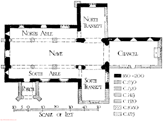 The earliest building must have been of the 12th century, as there is evidence of 13th-century additions. The transept piers do not bond into the east wall of the nave, which, with its 4 feet (1.2 m) thick wall, probably formed part of the original church. The eastern arches of the aisles spring from plain-splayed imposts, and the starting pier of the south aisle does not bond into the west wall.[7]
