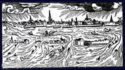 The All Saints' Flood of 1570 occurred on November 1–2, 1570 in the Spanish Netherlands, and is considered the worst North Sea flood disaster before the 20th century. It flooded the entire coast of the Netherlands and East Frisia. The effects were felt from Calais in Flanders to Jutland and even Norway.[1] Even though the alleged casualty figures were mostly based on rough estimates and should be viewed with skepticism, up to 25,000 deaths can be assumed.[2]