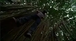 Charlie Pace (Dominic Monaghan) hanging from a tree by his neck. Monaghan had to be harnessed to a cable for up to five hours during the shoot. Jack's later attempts to revive Charlie was commended by critics. | |