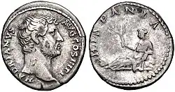 Hadrian made frequent trips to many provinces of the Empire, and to commemorate these trips in a propagandistic way, coins relating to these trips were minted by each province. One of them corresponds to Hadrian's trip to Hispania. The most famous allegory of Hispania was coined in Rome; it was a female figure with a long tunic, stamped with laurel or olive, reclining to the left, with her left arm on some rocks, which could refer to the Pyrenees. With his right hand he holds an olive branch. At the feet of the figure appears a rabbit, the animal that the Phoenicians theoretically used to name the peninsula: Hishphanim.