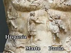 On the breastplate of the statue of Augustus of Prima Porta Hispania appears on the right hand side (on the left when looking at the sculpture). It is found behind the back of Mars, god of war, in a seated and afflicted position carrying the gladius hispaniensis. The fact that it has been represented with its back to Mars and defeated alludes to the victory of Augustus against cantabrians and astures.[3]