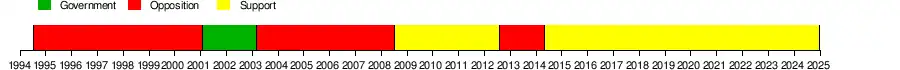 | Year | Leader | Popular vote | % of popular vote | # | # of seats | Seat change | Coalition | Status |