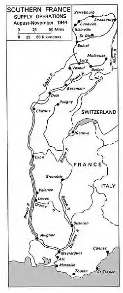 On 10 September, the Coastal Base Section was renamed the Continental Base Section.[68] Dijon was captured the following day, and on 18 September the advance party of the Continental Base Section headquarters moved there, followed by the main body on 1 October. It was initially established in the Grand Hôtel La Cloche, but later moved to the former Gestapo headquarters at 32 Rue Talant.[69] On 26 September, the Continental Base Section was redesignated the Continental Advance Section (CONAD), effective 1 October. The Marseille area was turned over to the new Delta Base Section, under Ratay's command.[70] The boundary between the two was the northern boundaries of the French departments of Ain, Rhône, Loire and Allier.[65] The Delta Base Section became responsible for 190,000 troops spread over 110,000 square miles (280,000 km2).[71]