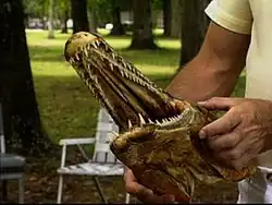 On September 4, 2009, a 3 ft 3 in (0.99 m) alligator gar was found in Tak Wah Park in Tsuen Wan, Hong Kong. Over the next two days, at least 16 other alligator gar, the largest measuring 4.9 ft (1.5 m), were found in ponds within public parks in Hong Kong.[34] Nearby residents reported the alligator gar had been released into the ponds by aquarium hobbyists, and had lived there for several years. However, after a complaint made by a citizen who falsely identified alligator gar as crocodiles, the use of terms like "horrible man-eating fish" had begun appearing in the headlines of some major local newspapers. Officials with Leisure and Cultural Services in Tak Wah Park removed all the alligator gar from the ponds because they were concerned the large, carnivorous fish might harm children.[35] Not unusually, the large, sharp teeth and outward appearance of alligator gar can precipitate unreasonable fear in those unfamiliar with the species. Sensationalized reports have contributed to the misconception of predatory attacks by alligator gar on humans, though none of the reports have been confirmed.