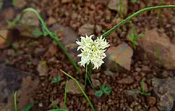 This onion grows from a bulb or a cluster of a few bulbs which are rounded in shape and measure up to 1.2 centimeters long by 1 wide. There are two leaves which are flat and linear in shape and measure up to 24 centimeters in length. They usually begin to wither from the tip by the time the plant is in flower. The flowering stalk is up to 15 centimeters tall and bears an umbel of 10 to 20 bell-shaped white flowers with green or pink midribs.[4][6] The fruit is a capsule.[7] The plant reproduces sexually by seed or vegetatively by sprouting from its bulb.[3]