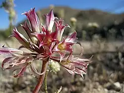 Allium parishii is an uncommon species of wild onion known by the common name Parish's onion. It is native to the Mojave Desert and Sonoran Deserts of California (San Bernardino, Riverside, and San Diego Counties) and Arizona (Yuma and Mohave Counties). It grows on open dry, rocky slopes at elevations of 900–1,400 m (3,000–4,600 ft).[1][2][3][4]
