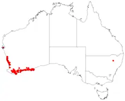 Allocasuarina lehmanniana grows in winter-wet places in near-coastal areas from Jurien Bay to near Albany and east to Ravensthorpe in the Avon Wheatbelt, Carnarvon, Esperance Plains, Geraldton Sandplains, Jarrah Forest, Mallee, Swan Coastal Plain and Warren bioregions of south-western Western Australia.[2][3] Subspecies ecarinata occurs from near Ongerup to east of Esperance in the Esperance Plains and Mallee bioregions[10][9] and subsp. lehmanniana between Jurien Bay to east of Albany in the Avon Wheatbelt, Esperance Plains, Geraldton Sandplains, Jarrah Forest, Mallee, Swan Coastal Plain and Warren bioregions.[13][12]