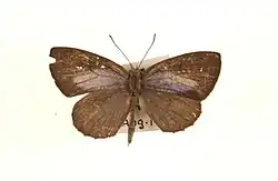 Female upperside: similar to that of the male, but the violaceous area on both forewings and hindwings of much greater extent. Underside: also similar to that of the male, but the ground colour brighter with a tinge of yellow; the markings more ochraceous than brown, more conspicuous and prominent. Antenna, head, thorax and abdomen as in the male but paler.[3]