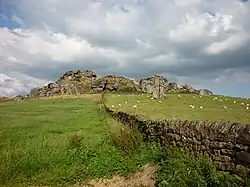 Almscliffe Crag, or Almscliff Crag, also known as Great Almscliff Crag to distinguish it from Little Almscliff, 3 miles (5 km) north west, is a Millstone Grit outcrop at the top of a small hill near the village of North Rigton, between Leeds and Harrogate in North Yorkshire, England. The crag lies on the boundary of the civil parishes of North Rigton and Stainburn. The crag was formed due to the softer adjacent strata of shale and mudstone eroding at a faster rate than the hard wearing millstone.[1]